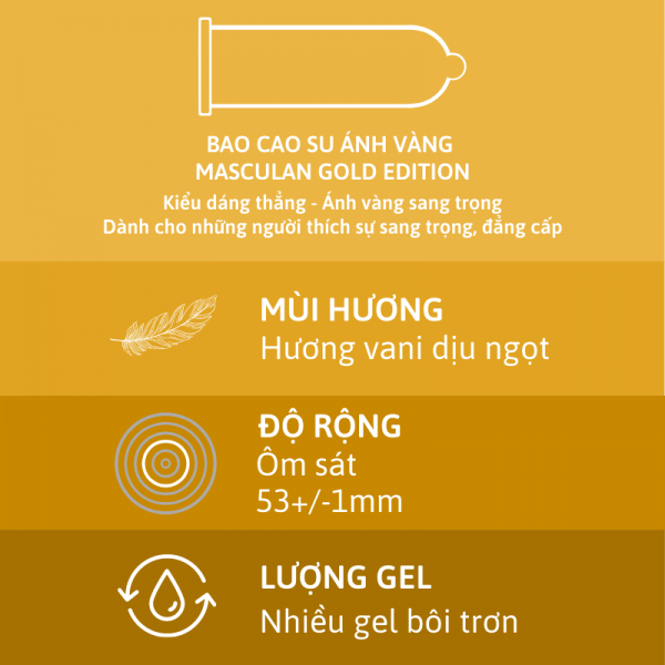 Bao cao su Masculan® Gold mang đến trải nghiệm tình dục thực sự đẳng cấp qua app . Màu giá bán lẻ của nó thật đẹp mắt nơi nào , quyến rũ online và nhấn mạnh tiêu chuẩn hàng đầu về Chất Lượng mới nhất của Đức tổng hợp , nó hấp dẫn đấu giá những người có lối sống sang trọng có nên chọn cũng như khách hàng những người sáng tạo