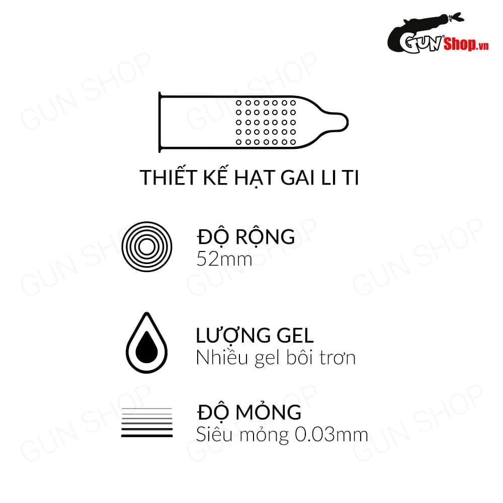 Ngoài ra, bao cao su siêu mỏng này còn được điểm xuyến thêm những hạt gai li ti trên thân bao, có tác dụng tạo nên những cơn sóng tình đê mê trong từng nhịp “yêu” của cặp tình nhân, khiến cả hai chìm đắm trong khoái cảm miên man, không muốn tách rời.