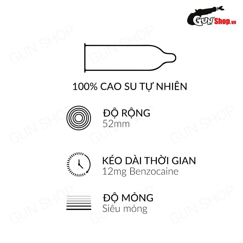 Bao cao su được làm từ cao su thiên nhiên cao cấp an toàn cho người sử dụng, không gây kích ứng. Sản phẩm có thiết kế siêu mỏng, ôm sát và có độ đàn hồi cao, “mỏng nhưng không lỏng”, giúp các quý ông tự tin chinh chiến, không lo tuột bao.