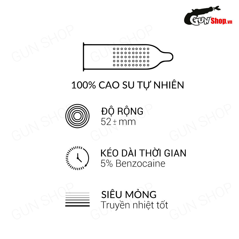 Sản phẩm bao cao su kéo dài thời gian này được bổ sung tinh chất gây tê cục bộ, giúp áp chế nhanh chóng tình trạng xuất tinh sớm ở nam giới. Đem đến cho các quý ông những khoảng lặng “tĩnh tâm”, kìm hãm hưng phấn để có thêm nhiều thời gian “mây mưa” bên cô đào ngọt nước.
