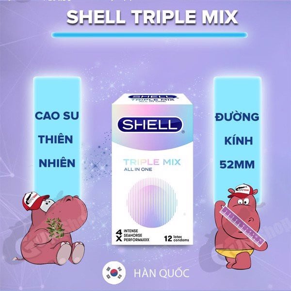 Shell Triple Mix là dòng bao cao su gồm 12 cái/hộp được kết hợp 3 sản phẩm khác nhau: